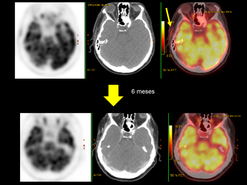 Se realiza PET-CT de control a los 6 meses de iniciado el tratamiento, que muestra respuesta morfo-metabólica parcial, con disminución de la actividad en grandes vasos incluyendo arteria temporal derecha y mejoría radiológica de las alteraciones inflamatorias circundantes (Figs. 4 y 5). Los datos cuantitativos comparativos (SUV) son los siguientes: