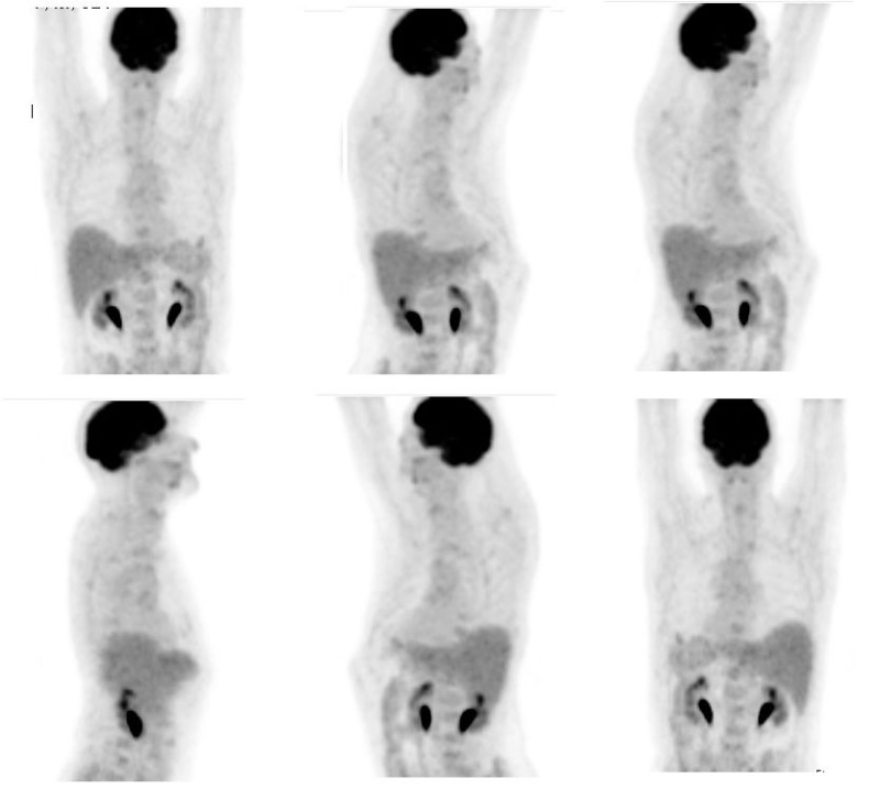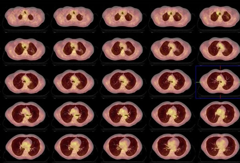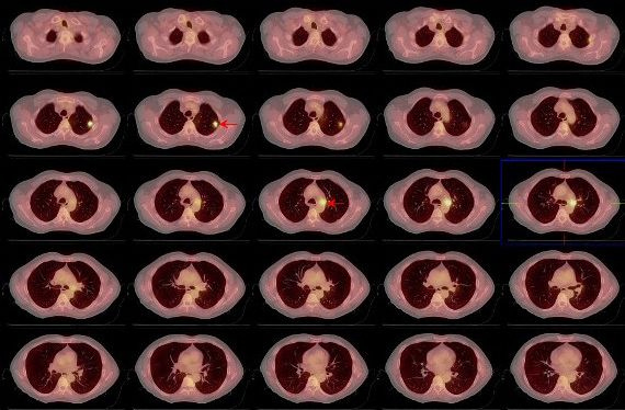 Ante los hallazgos del PET corporal y PET-CT torácico se decide realizar nuevamente con éxito una PAAF pulmonar. La AP informó un carcinoma indiferenciado de pulmón de células pequeñas. Tras el diagnóstico de segundo tumor pulmonar, se decide administrar tratamiento concomitante de RT locoregional y quimioterapia (QT) con Cisplatino y VP6, a un total de 6 ciclos. Recibe tratamiento de RT locoregional sobre el nódulo pulmonar superior izquierdo y ganglios regionales a razón de 2Gy/día, 5 días a la semana hasta un total de 60Gy. Posteriormente y estando el paciente asintomático, se solicita PET corporal y PET-CT torácico de reestadiaje y de valoración de respuesta terapéutica.