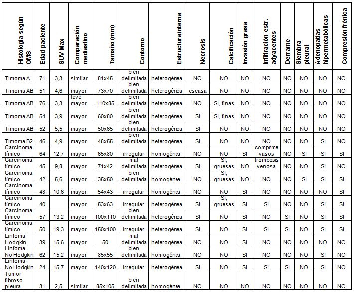 Las patologías estudiadas fueron confirmadas histológicamente y consistieron en 6 timomas, 1 de tipo A, 4 AB y 1 B2, según clasificación de la OMS; 7 carcinomas tímicos, 3 linfomas (1 linfoma de Hodgkin y 2 linfomas No-Hodgkin difuso de células grandes B) y un tumor fibroso de la pleura. En la tabla 1 y en la figura 1 se muestran las características morfológicas y metabólicas de las tumoraciones estudiadas.