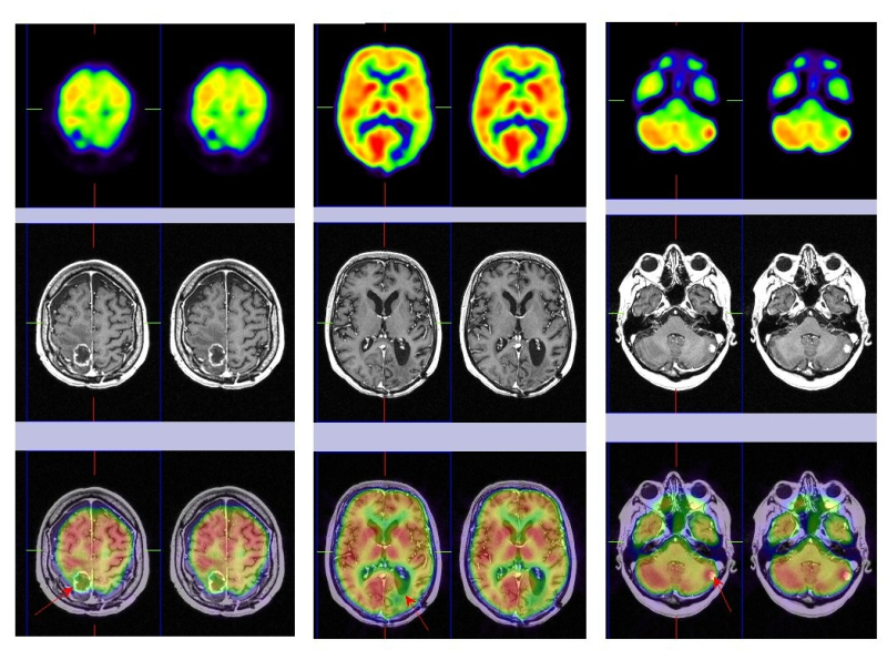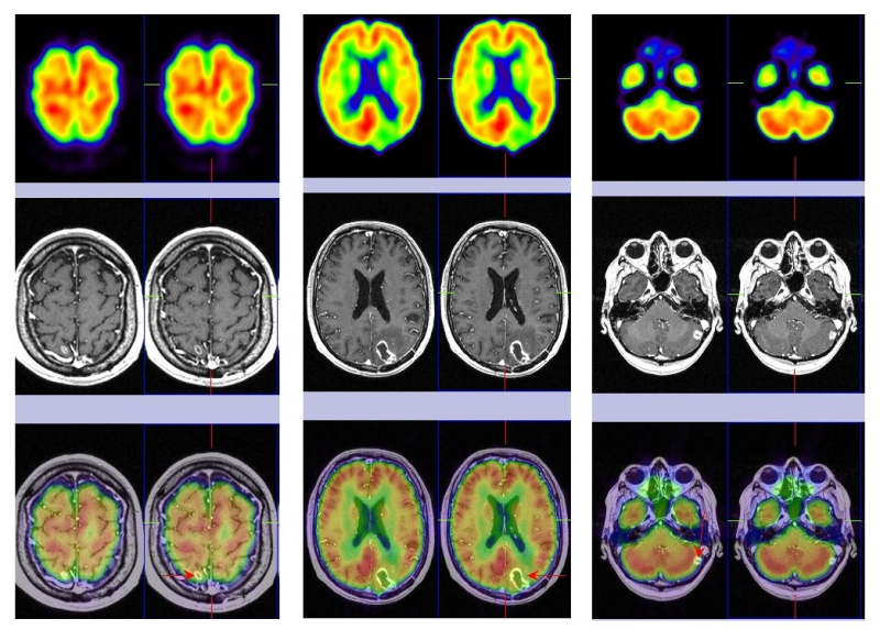 La paciente muestra una franca mejoría neurológica y al cabo de 5 meses se le realiza como estudios de re-estadificación un PET-TC corporal que fue normal y una PET-RM cerebral que muestra ausencia de captación de 18F-FDG en las tres lesiones cerebrales conocidas (fig. 1), siendo el hallazgo indicativo de cambios postratamiento (radionecrosis). La paciente recibe corticoides a dosis decrecientes, con buena respuesta clínica.