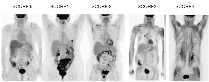 Roy(22) et al. discutem em seu estudo sobre os valores alterados de glicemia e como isso pode influenciar na captação do FGD. Pacientes que apresentam uma glicemia maior que (126 mg/dL) podem apresentar uma redução na sensibilidade do estudo com FDG. Entretanto, pacientes diabéticos que possuem uma glicemia abaixo de (180 mg/dL), apresentam uma biodistribuição adequada do FDG-18F. Os autores classificaram a variação na biodistribuição do FDG em relação à sua captação muscular em diferentes grupos, identificando pontuações entre 0 e 4, demonstrando, portanto, a variação na sensibilidade do método, com o aumento na captação muscular. Na biodistribuição normal, o paciente é identificado com a pontuação 0. Nos casos onde a biodistribuição apresentou alterações, o paciente com captação suave foi identificado com o valor 1; quando a absorção foi muscular, envolvendo mais de um grupo muscular, obteve pontuação 2; nos casos com absorção muscular difusa de intensidade moderada, a pontuação foi 3; e o paciente que apresentou uma absorção muscular difusa e intensa, resultando em exame não diagnosticado, obteve a pontuação máxima que foi 4 (fig. 1). Abaixo, as imagens mostram um exemplo dessa biodistribuição normal e alterada (fig. 2).