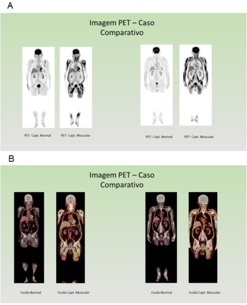Figura 2 Imagem comparativa. Captação normal vs. captação muscular do FDG por ativação do GLU-4 dependente de insulina. Em A, PET; em B, fusão PET/CT. Fonte: Arquivo próprio dos autores.