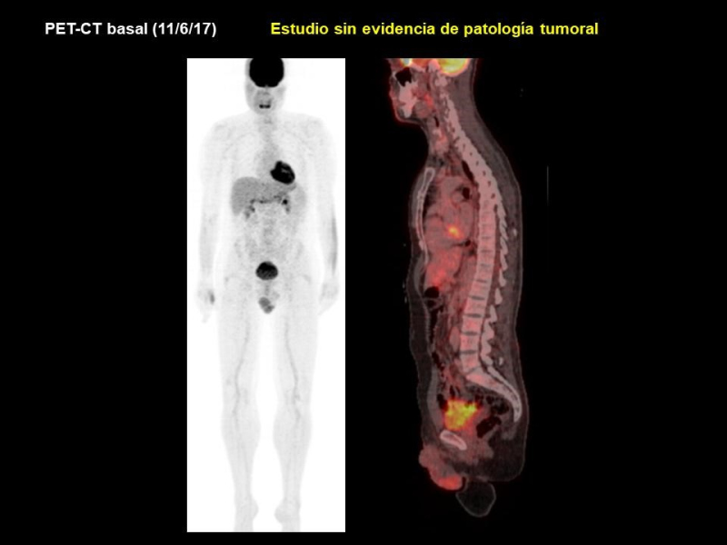 Al tratarse de un melanoma de alto riesgo se realiza PET-CT previo a la ampliación de márgenes y detección intraoperatoria de ganglio centinela, que no muestra evidencia de afectación a distancia (Fig. 1). El 22/06/2016 es reintervenido, realizándose ampliación con márgenes de 2 cm de cicatriz en dorso y posterior detección de ganglio centinela en región inguinal izquierda (Fig. 2). La anatomía patológica muestra fibrosis dérmica cicatricial y reacción granulomatosa tipo cuerpo extraño, sin evidencia de infiltración tumoral. El ganglio centinela (estudio inmunohistoquímico protocolizado) no presenta evidencia de infiltración metastásica. En agosto de 2017 se realiza control clínico. En la exploración física se describe cicatriz en región lumbar dentro de la normalidad y la ecografía muestra ganglios inguinales sin elementos patológicos.