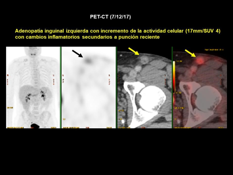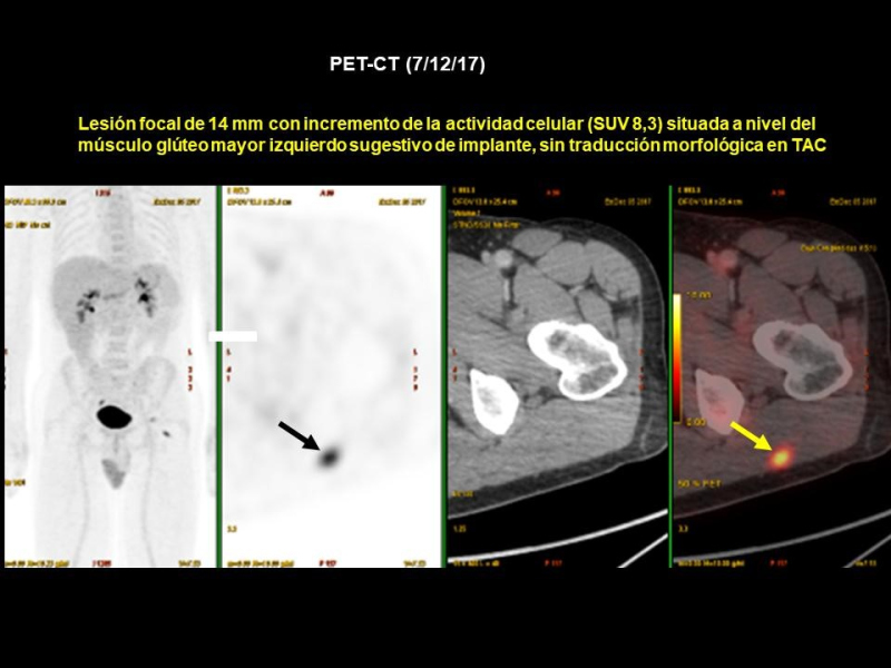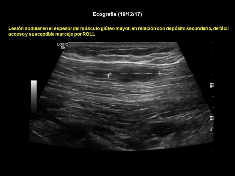 Se realiza PET-CT (7/12/17) previo a resección de adenopatía inguinal izquierda (Figs. 3 y 4), hallándose lesión focal de 14 mm con incremento de actividad metabólica (SUV 8,3) situada a nivel del músculo glúteo mayor izquierdo sugestivo de implante secundario, sin traducción morfológica en CT. Además, adenopatía inguinal izquierda con incremento de la actividad metabólica (17mm/SUV 4) compatible con posibles cambios inflamatorios secundarios a punción reciente. Una nueva ecografía muestra lesión nodular en el espesor del músculo glúteo mayor, en relación con depósito secundario, de fácil acceso y susceptible de marcaje por ROLL (Fig. 5). También se encuentran dos adenopatías inguinales izquierdas, con criterios de posible secundarismo ganglionar.