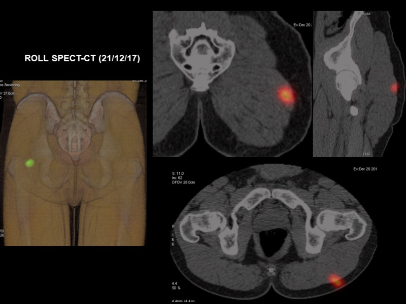 El 21/12/17 se procede a linfadenectomía inguinal izquierda por metástasis ganglionar de melanoma y biopsia/resección de lesión muscular en glúteo izquierdo mediante técnica ROLL guiada por SPECT-CT y ecografía (Fig. 6). El diagnóstico anatomopatológico corresponde a ganglios linfáticos (linfadenectomía inguinal superficial izquierda) con metástasis de melanoma en uno de seis, con extensión extracapsular. El fragmento remitido de músculo estriado (glúteo) se encuentra metastatizado por una neoplasia melánica maligna. No existe afectación de bordes quirúrgicos de resección. El perfil inmunohistoquímico es compatible con metástasis de melanoma. La lesión tumoral es positiva con HMB45 y S100.