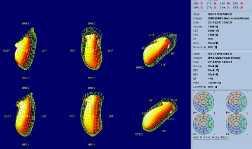Con este resultado, el cardiólogo solicita SPM sensibilizado con dipiridamol, realizado con protocolo de 2 días. El test de provocación farmacológica con dipiridamol fue anormal por infradesnivel del ST de 1 mm de V1 a V4, con comportamiento presor normal. El SPM muestra un defecto parcialmente reversible ánteroseptal y apical interpretado como infarto de miocardio con significativa isquemia periinfarto. La evaluación de la función ventricular mostró hipoquinesia anteroseptal con aquinesia septoapical y función ventricular global levemente descendida (figs. 6 y 7).