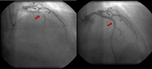 Se realiza CACG que evidencia lesión de 98% en tercio medio de ADA, la que se revasculariza con colocación de stent (figs. 8 y 9). La arteria coronaria derecha (CD) y la circunfleja (Cx) no presentan lesiones significativas.