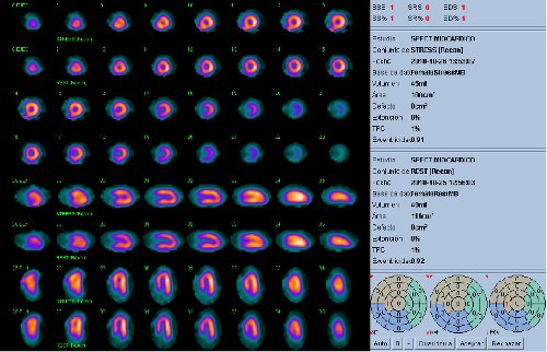 A los 8 meses de la revascularización la paciente consulta por dolores precordiales atípicos y palpitaciones rápidas. El cardiólogo solicita nuevo SPM que se realiza con estrés farmacológico (dipiridamol). La prueba de estrés no mostró elementos clínicos ni electrocardiográficos sugestivos de isquemia residual. Las imágenes del SPM muestran perfusión normal con reversibilidad completa de las alteraciones vistas en el estudio previo, tanto de perfusión como de motilidad (figs. 9 y 10).